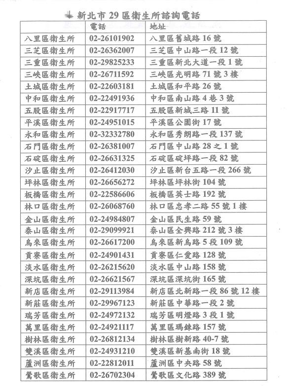 新北市29區衛生所名單