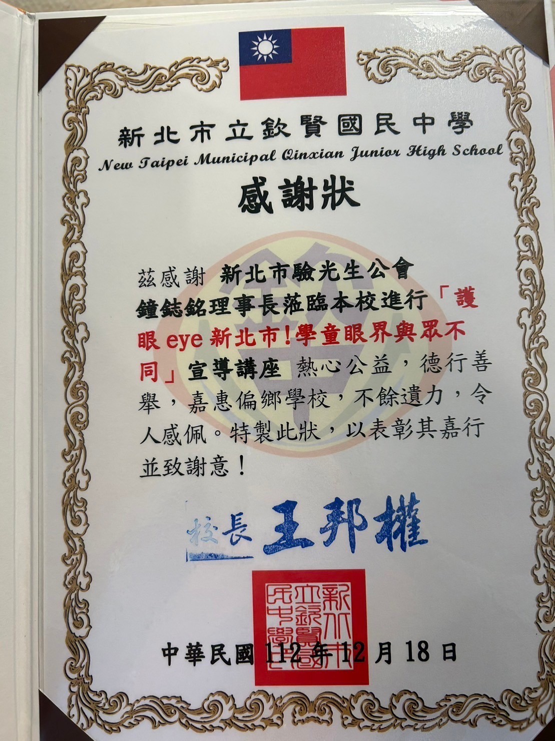 來到新北市瑞芳區「欽賢國中」視力保健講座,學校位九分熱區的山頂上~遠眺太平洋、隔壁是基隆山~視野開闊,有一群熱情、用心的老師和開朗活潑的同學,很開心有機會來到這個學校和同學們分享我們的專業。