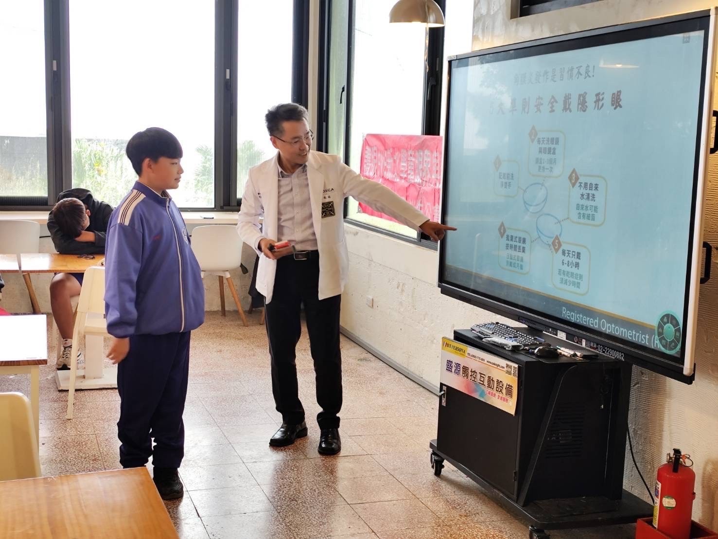 與王邦權 校長、校務組長、主任、校護⋯多方交流,聊了學校的需求。王校長表示真的很需要我們公會專業的協助,能在能力範圍走進更多偏鄉國中學校。所以也已先預約了下學期的視力保健推廣「講座」和「篩檢」。