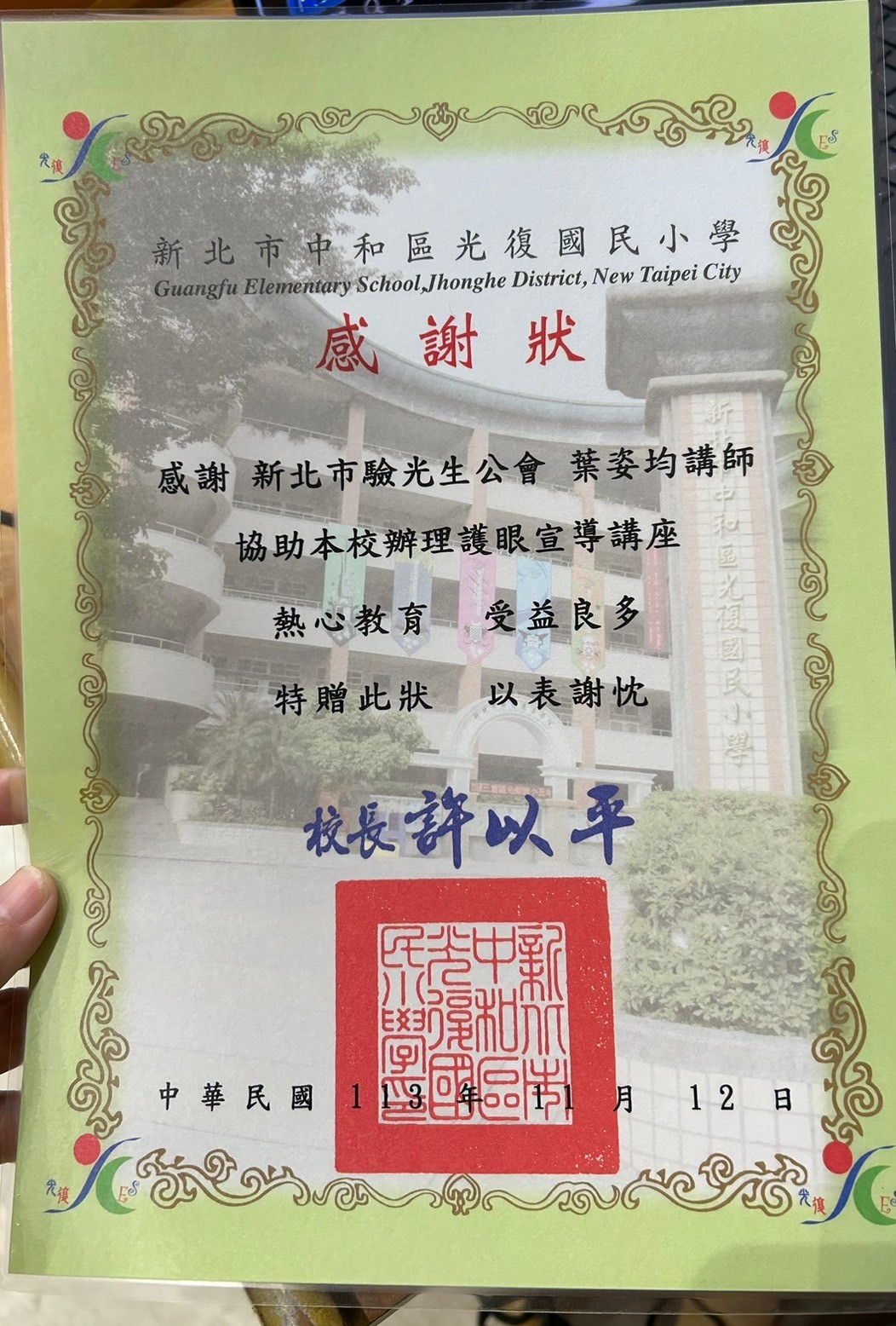 本次活動特別邀請到監事長葉姿均主講護眼宣導,為光復國小的學童們帶來生動有趣的護眼知識,並鼓勵大家在日常生活中採取簡單的護眼措施來保護視力。