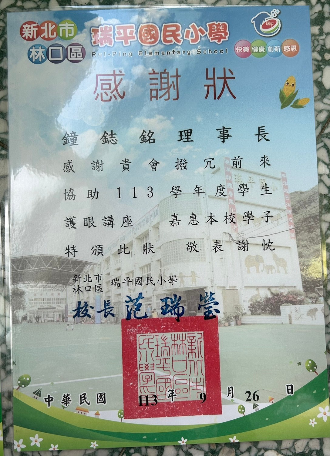 位於西濱公路旁的瑞平國小,鐘理事長深入淺出地為全校學生講解保護眼睛的重要性,內容涵蓋了: